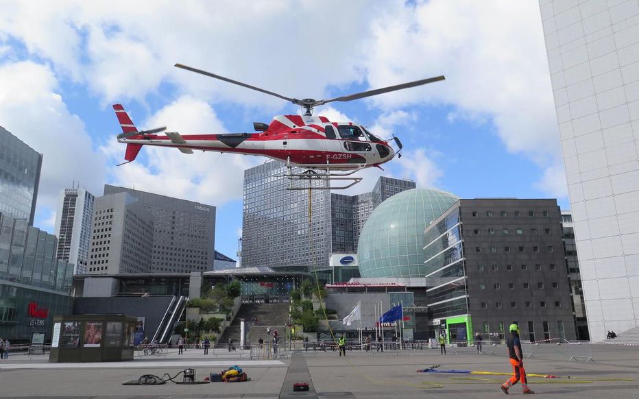 Six blocs de climatisation ont été hissés sur le toit d’un immeuble voisin de la grande Arche ce samedi matin et deux autres redescendus, le tout par un hélicoptère qui a décollé du parvis.