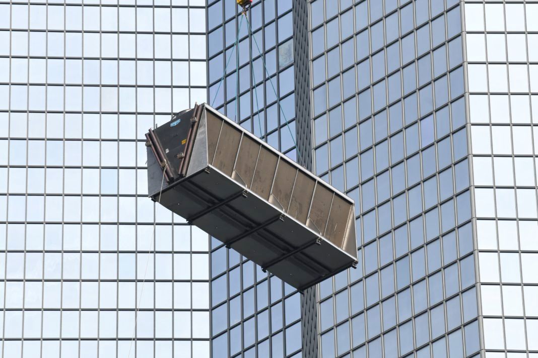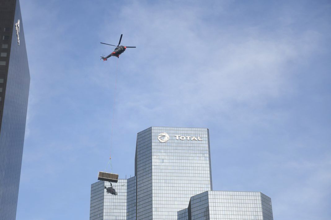 Un Super Puma a acheminé ce samedi plusieurs équipements de climatisation au sommet de la tour Total Coupole.